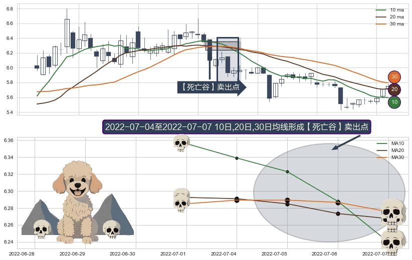 形态多维评估: ⚀ 2022-07-05-日至2022-07-07-日显现 10日-20日-30日均线 【死亡谷】卖出点 看空信号,后市看跌,卖出