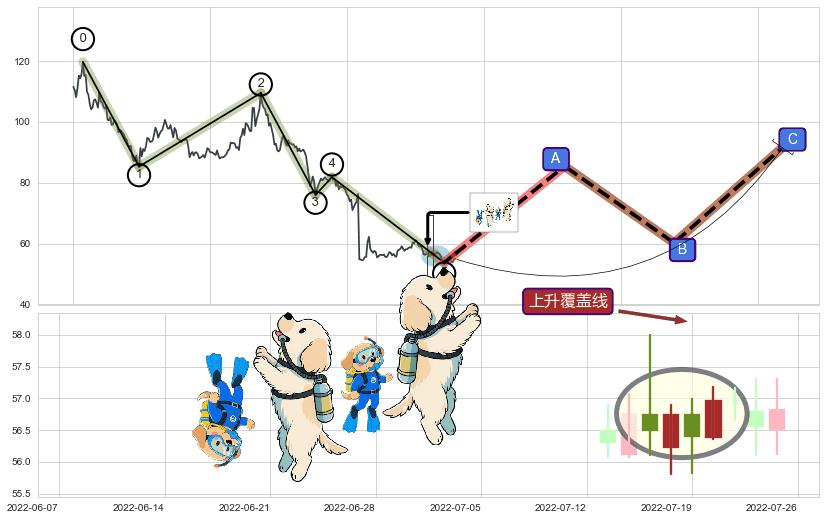 | 7 🅚:曙光初现形态 ➕ 🌊:波浪理论猜想下跌浪5已形成,猜想后续形成abc反弹上涨(均值回复) ☞ 看多信号 ⇥ 【🅚线】交织【图形】⇥ 综合量化分数: 57 | > |