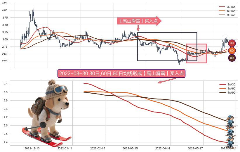 形态多维评估: ⚀ 2022-01-20日-2022-06-08日显现 30日-60日-90日均线 【高山滑雪】买入点 看多信号,后市看涨,买入