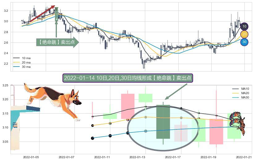 形态多维评估: ⚀ 2022-01-14日显现 10日-20日-30日均线 【绝命跳】卖出点 看空信号,后市看跌,卖出