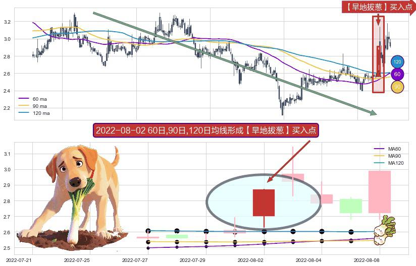 形态多维评估: ⚀ 2022-08-02日显现 60日-90日-120日均线 【旱地拔葱】买入点 看多信号,后市看涨,买入