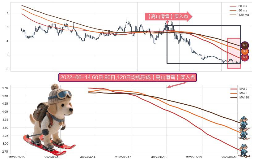 形态多维评估: ⚀ 2022-04-08日-2022-08-12日显现 60日-90日-120日均线 【高山滑雪】买入点 看多信号,后市看涨,买入