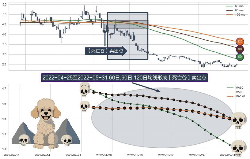 形态多维评估: ⚀ 2022-04-26-日至2022-05-31-日显现 60日-90日-120日均线 【死亡谷】卖出点 看空信号,后市看跌,卖出
