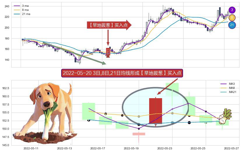 ⚂ 2022-05-30日突然冒出一根大阳线,一下子顶穿三条均线且收盘价收在各条均线之上