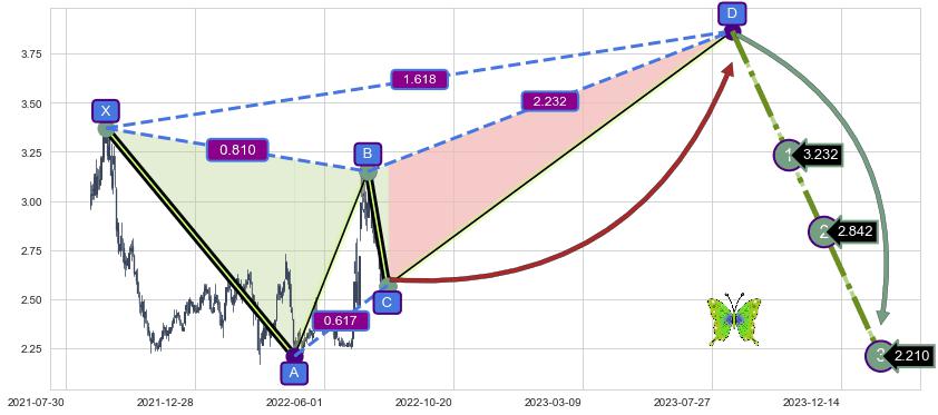 ➣ 未完成【蝴蝶】形态起点X: 2021-09-13, 已到达C点: 2022-08-10, 预测最终D点: 2023-08-18, 共485交易日