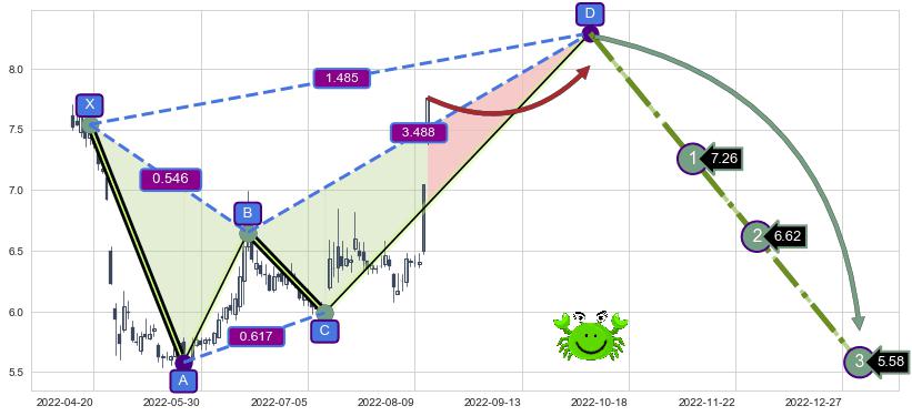 ➢ 距离预测D点位置尚有上涨空间,短线依然【看涨】, 耐心等待看跌【螃蟹】形态反转启动