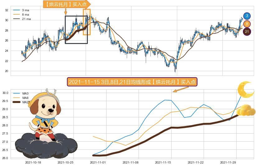 形态多维评估: ⚀ 2021-10-28日-2021-11-30日显现 3日-8日-21日均线 【烘云托月】买入点 看多信号,后市看涨,买入