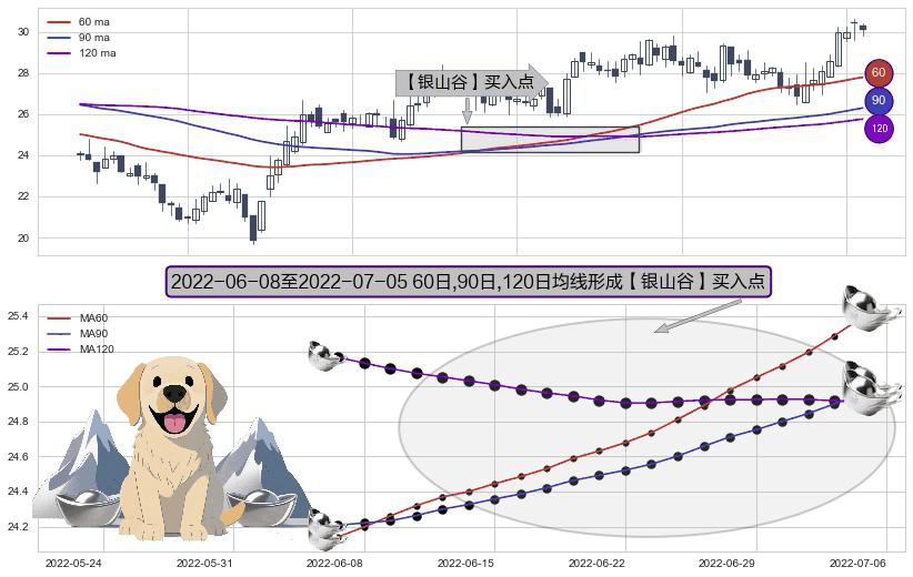 形态多维评估: ⚀ 2022-06-09-日至2022-07-05-日显现 60日-90日-120日均线 【银山谷】买入点 看多信号,后市看涨,买入