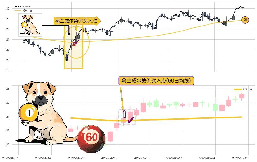 形态多维评估: ⚀ 2022-04-29-日显现 葛兰威尔均线 60日均线 第买①入点 走势反转见底信号,后市看涨,买进信号