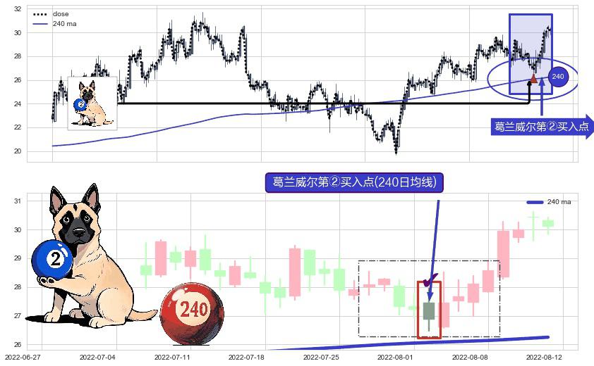 形态多维评估: ⚀ 2022-08-02-日显现 葛兰威尔均线 240日均线 第②买入点 上升趋势的中继信号,后市看涨,买进信号