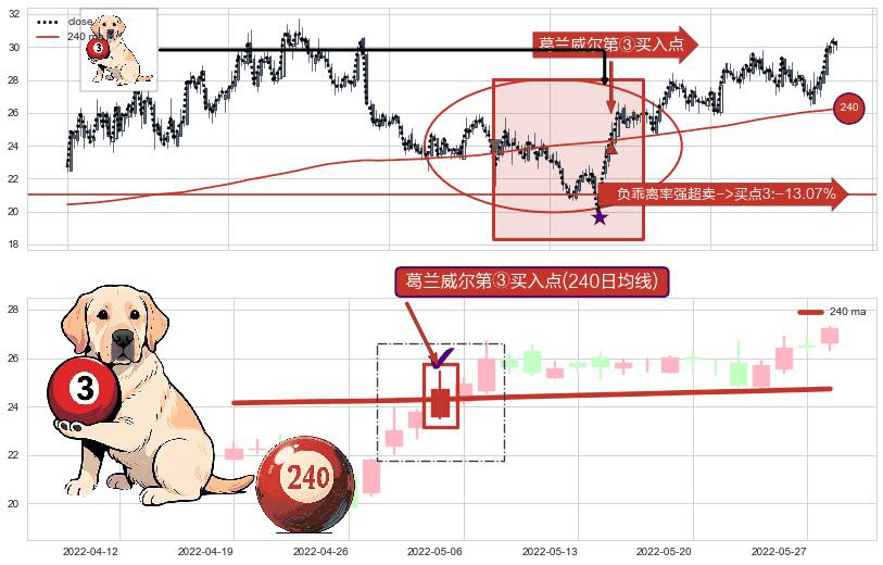 形态多维评估: ⚀ 2022-05-05-日显现 葛兰威尔均线 240日均线 第③买入点 上升趋势的中继信号,后市看涨,买进信号