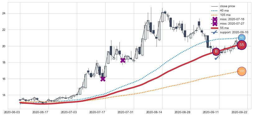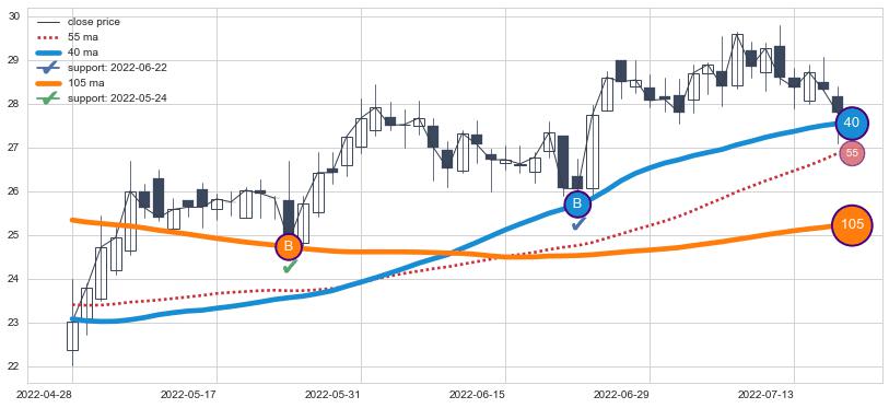 上涨趋势2022-04-28-2022-07-18,均线40, 105确认关键支撑2处