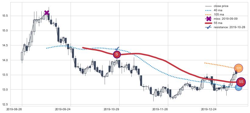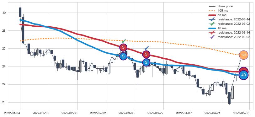 下跌趋势2022-01-04-2022-05-05,均线40, 55确认关键阻力2处