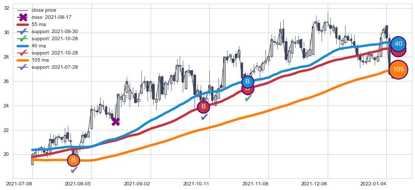 上涨趋势2021-07-08-2022-01-06,均线40, 105, 55确认关键支撑3处