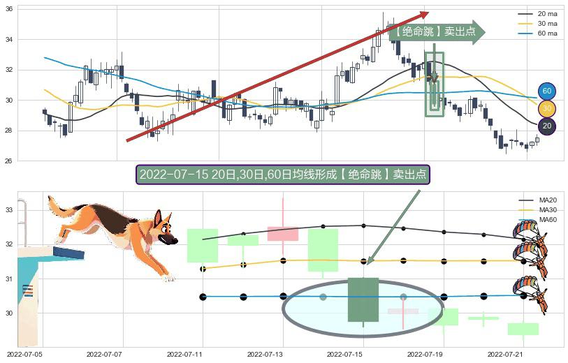 ⚀ 2022-07-15日显现 20日-30日-60日均线 【绝命跳】卖出点 看空信号,后市看跌,卖出