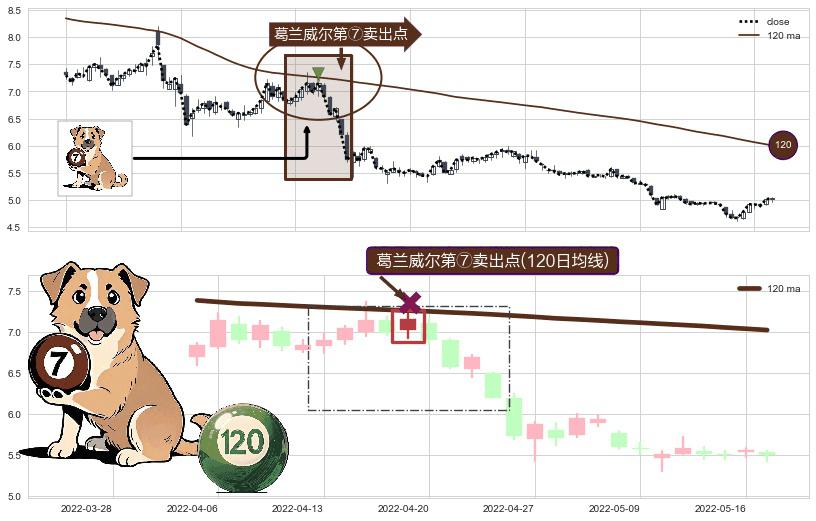 形态多维评估: ⚀ 2022-04-19-日显现 葛兰威尔均线 120日均线 第⑦卖出点 下降趋势的中继信号,后市看跌,卖出信号