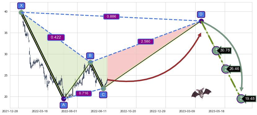 ➣ 未完成【蝙蝠】形态起点X: 2022-01-05, 已到达C点: 2022-08-03, 预测最终D点: 2023-03-23, 共306交易日