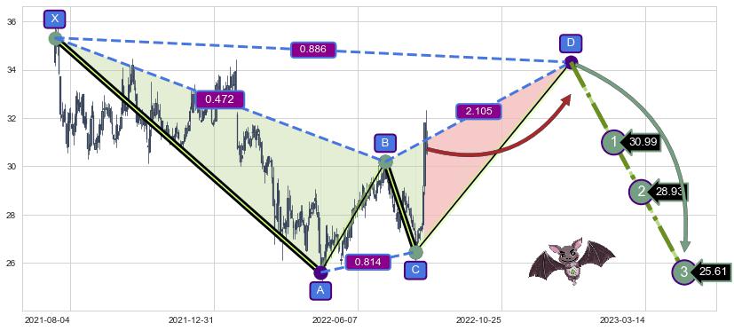 ➣ 未完成【蝙蝠】形态起点X: 2021-07-20, 已到达C点: 2022-08-02, 预测最终D点: 2022-12-30, 共358交易日