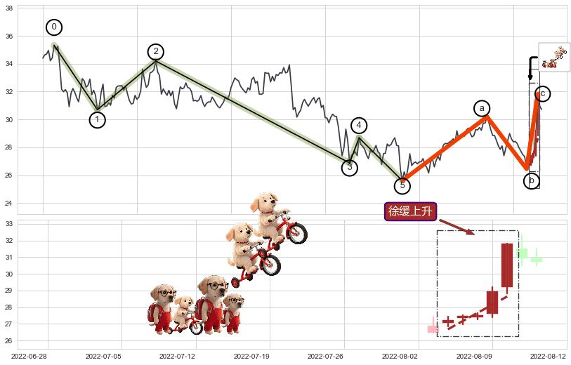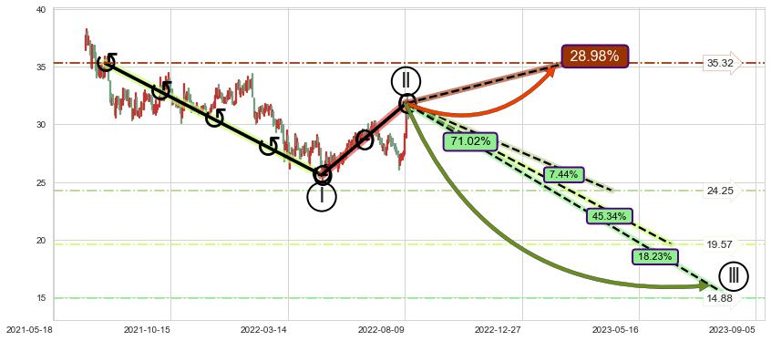 ➢ 循环浪继续向下【最低】位置(2023-09-05, 14.88),匹配聚类样本比例25.68%, 可能性概率18.23%