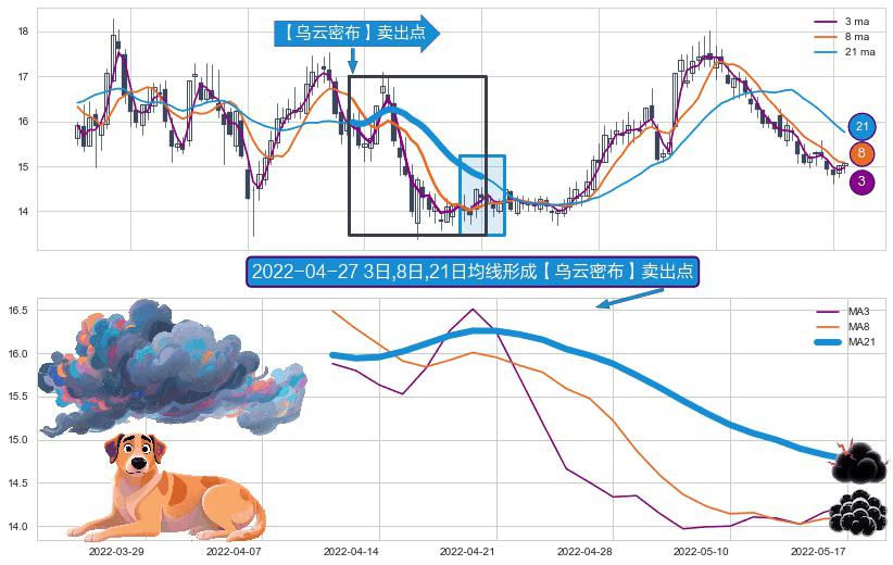 形态多维评估: ⚀ 2022-04-12日-2022-05-17日显现 3日-8日-21日均线 【乌云密布】卖出点 看空信号,后市看跌,卖出