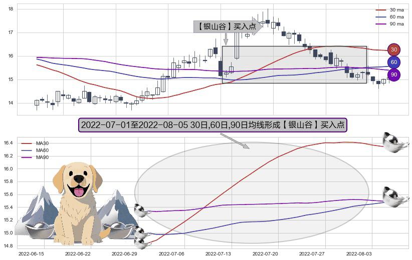 形态多维评估: ⚀ 2022-07-04-日至2022-08-05-日显现 30日-60日-90日均线 【银山谷】买入点 看多信号,后市看涨,买入