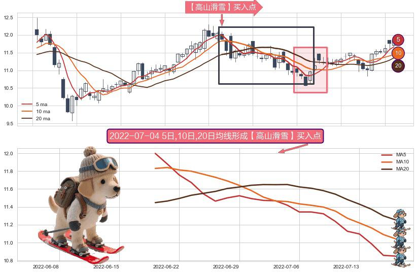 形态多维评估: ⚀ 2022-06-20日-2022-07-18日显现 5日-10日-20日均线 【高山滑雪】买入点 看多信号,后市看涨,买入