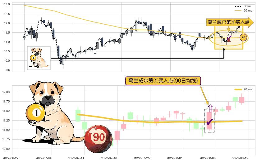 形态多维评估: ⚀ 2022-08-05-日显现 葛兰威尔均线 90日均线 第买①入点 走势反转见底信号,后市看涨,买进信号