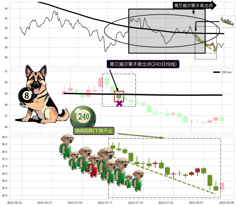 | 2 🅚:下跌两颗星 | 下跌三颗星 ➕ 🎢:葛兰威尔第⑧卖出点卖出点信号形成后,猜想后续持续下行(趋势跟踪) ☞ 看空信号 ⇥ 【均线】交织【🅚线】⇥ 综合量化分数: 41 | > |