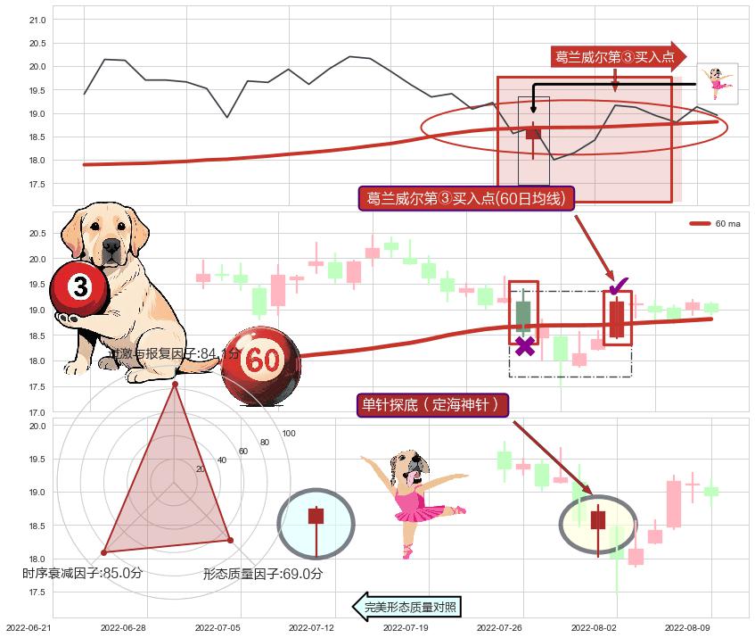 | 19 🅚:单针探底(定海神针) ➕ 🌊:波浪理论猜想下跌浪5已形成,猜想后续形成abc反弹上涨(均值回复) ☞ 看多信号 ⇥ 【🅚线】交织【图形】⇥ 综合量化分数: 55 | > |