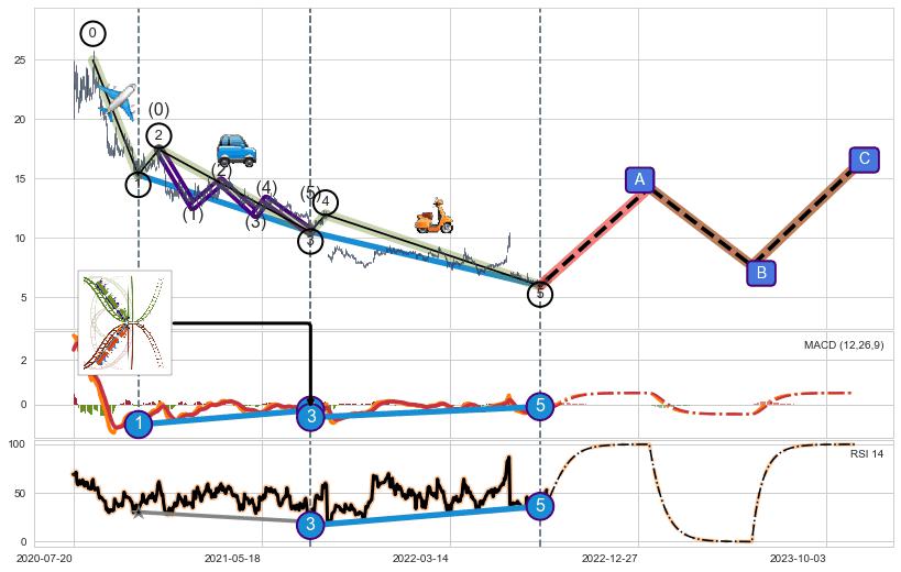 ➣ 第一, 三, 五浪下跌动能逐渐【衰弱变小】,趋势呈现不稳迹象