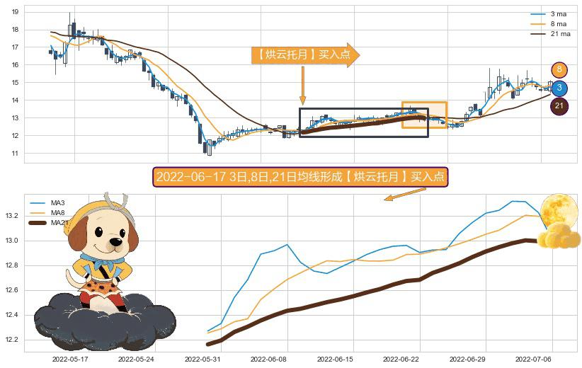 形态多维评估: ⚀ 2022-05-30日-2022-07-06日显现 3日-8日-21日均线 【烘云托月】买入点 看多信号,后市看涨,买入