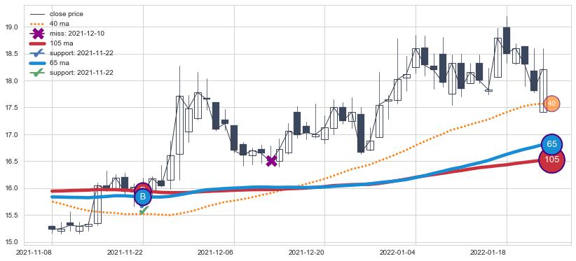 上涨趋势2021-05-07-2021-07-22,均线65, 105, 40确认关键支撑2处