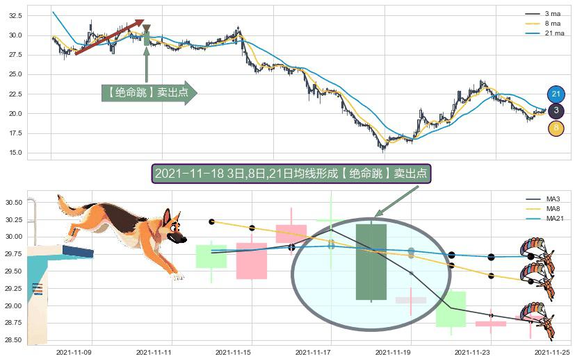 ⚀ 2021-11-18日显现 3日-8日-21日均线 【绝命跳】卖出点 看空信号,后市看跌,卖出