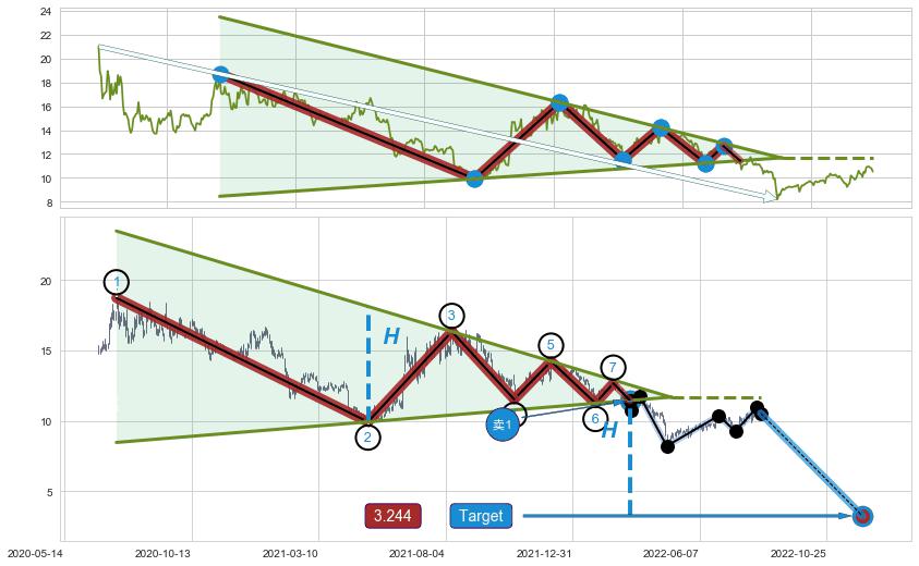 ➢ 最小中继整理跌幅→𝐇: 8.20 (低点逐步抬高斜边第一支撑点②与阻力边垂直距离)