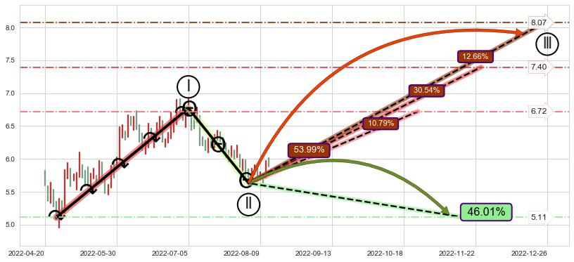 ➣ 循环浪继续向上【平均值】位置(2022-11-24, 7.40),匹配聚类样本比例56.57%, 可能性概率30.54%