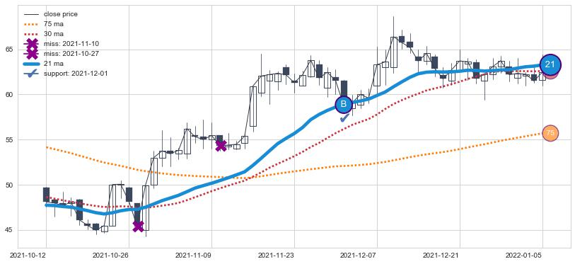 上涨趋势2022-03-23-2022-06-08,均线21, 30确认关键支撑4处