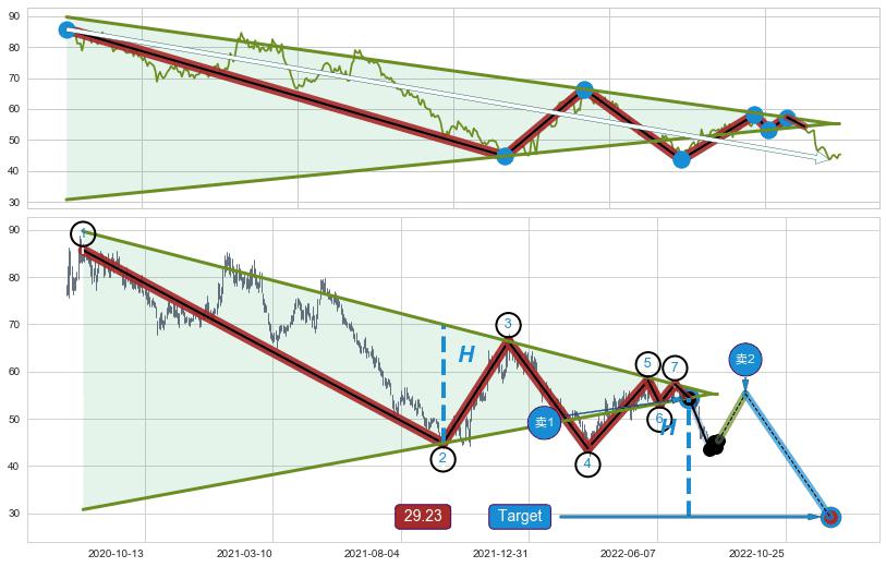 ➢ 最小中继整理跌幅→𝐇: 25.16 (低点逐步抬高斜边第一支撑点②与阻力边垂直距离)