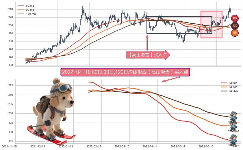 ⚀ 2022-01-26日-2022-07-01日显现 60日-90日-120日均线 【高山滑雪】买入点 看多信号,后市看涨,买入