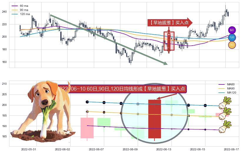 ⚀ 2022-06-10日显现 60日-90日-120日均线 【旱地拔葱】买入点 看多信号,后市看涨,买入