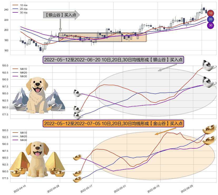 ⚃ 2022-05-13-日至2022-07-05-日显现 10日-20日-30日均线 【金山谷】买入点 其再次确认了买入信号,可靠性更强,买入