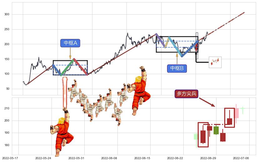 ➢ 【中枢B】:2021-12-30-2022-07-04,中枢由5笔构成,共121交易日, ZG=209.77, ZD=188.81