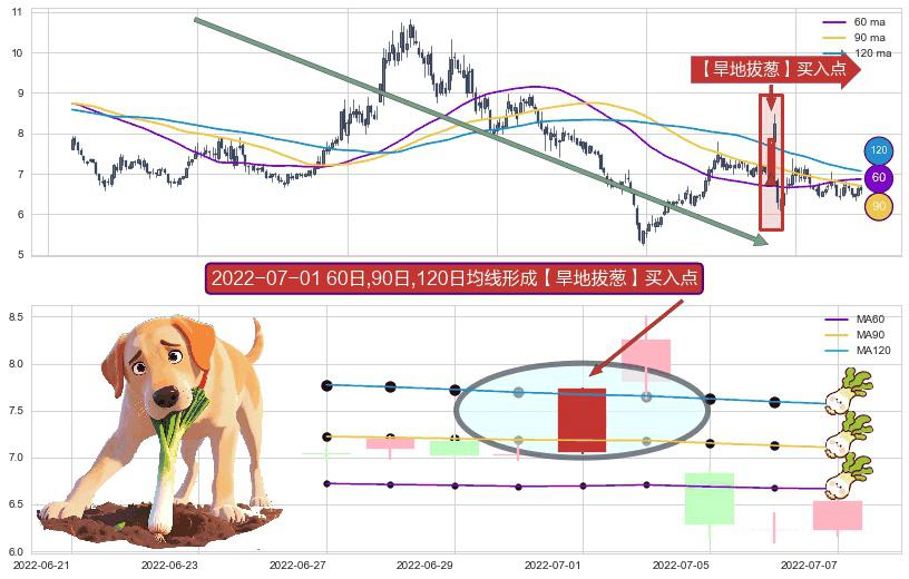 形态多维评估: ⚀ 2022-07-01日显现 60日-90日-120日均线 【旱地拔葱】买入点 看多信号,后市看涨,买入