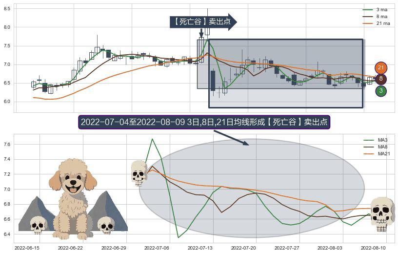 形态多维评估: ⚀ 2022-07-05-日至2022-08-09-日显现 3日-8日-21日均线 【死亡谷】卖出点 看空信号,后市看跌,卖出
