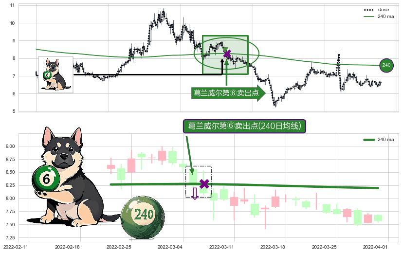 形态多维评估: ⚀ 2022-03-07-日显现 葛兰威尔均线 240日均线 第⑥卖出点 走势反转见顶信号,后市看跌,卖出信号