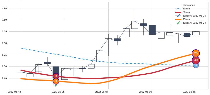 上涨趋势2022-05-18-2022-06-16,均线25, 30确认关键支撑1处