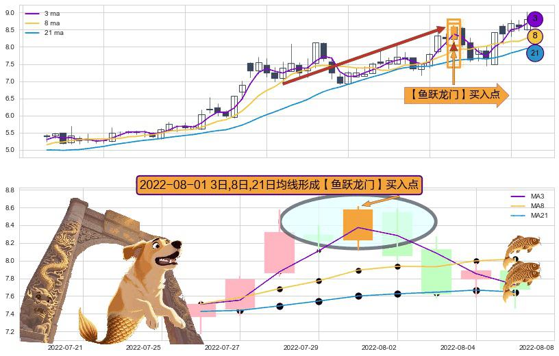 ⚀ 2022-08-01日显现 3日-8日-21日均线 【鱼跃龙门】买入点 看多信号,后市看涨,买入