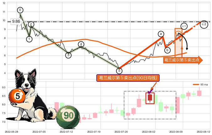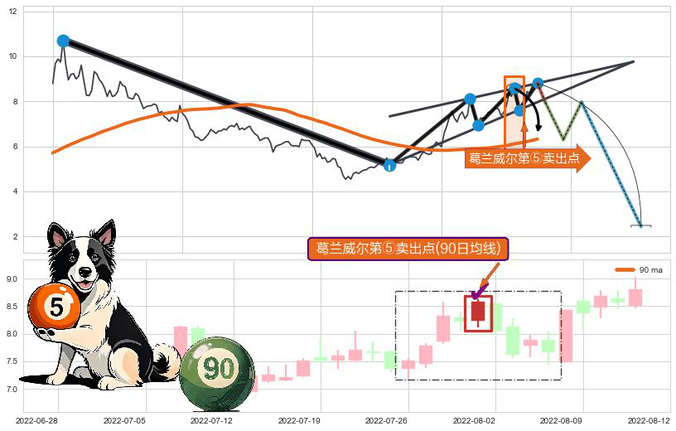 ➣ 🕰 价格走势在2022-07-27至2022-08-04期间形成葛兰威尔第⑤卖出点,残存影响值:-6.24
