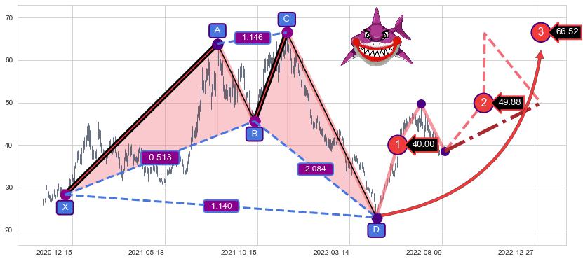 ➣ 已完成【鲨鱼】形态起点X: 2020-12-03, 终点D: 2022-04-26, 共338交易日