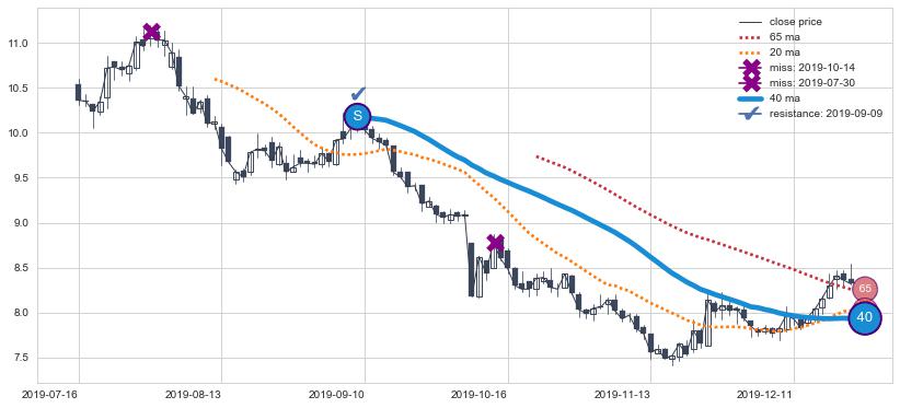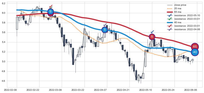 下跌趋势2022-02-08-2022-06-06,均线40, 65确认关键阻力3处