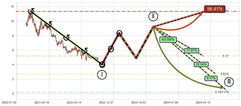 ➣ 5.1: 预测当前第5浪位置(2022-04-26, 4.62),仍然有下跌空间